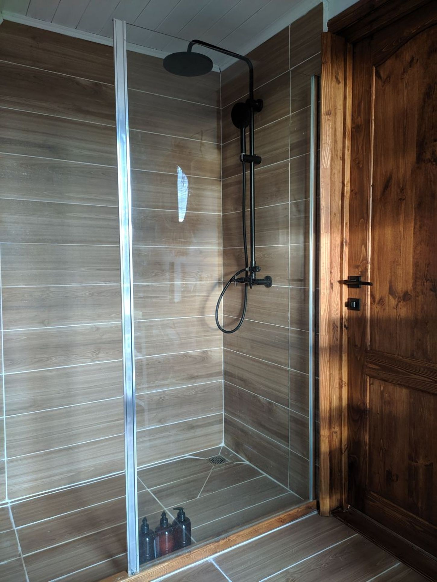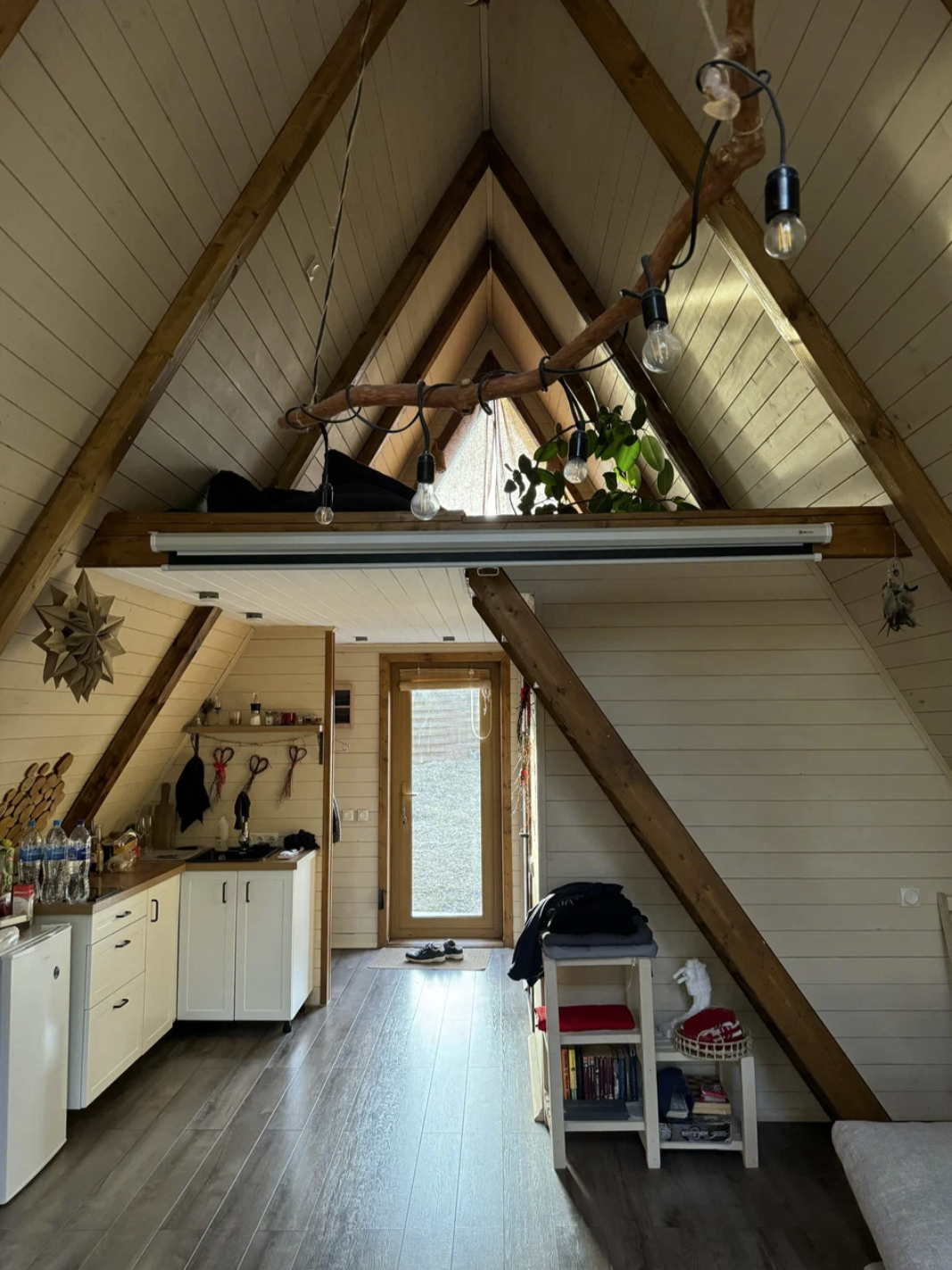 В доме есть оборудованная кухня, тёплый пол, двуспальный диван, мини-библиотека, кинопроектор и настольные игры. На втором уровне — комфортное спальное место с видом на лес. Санузел с тропическим душем и большим окном.
