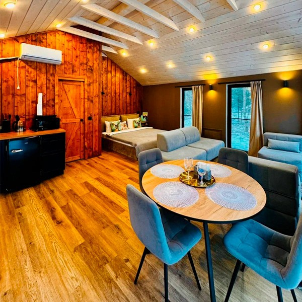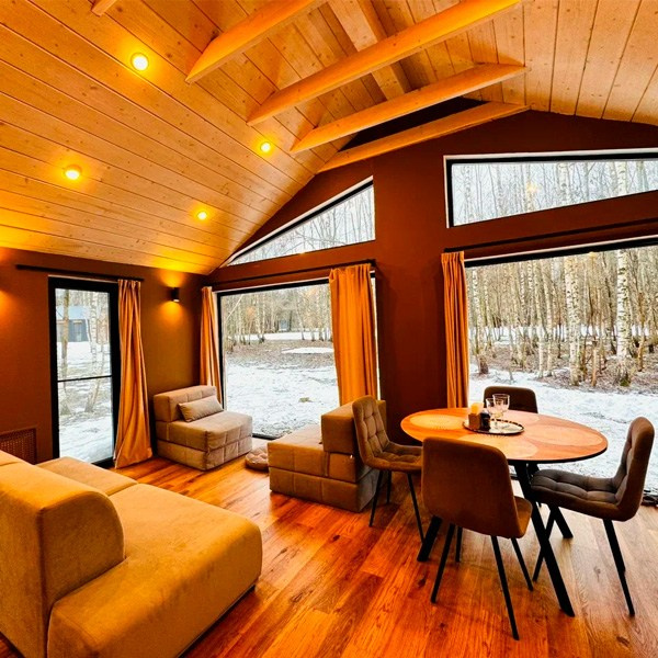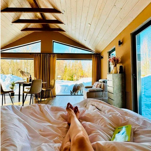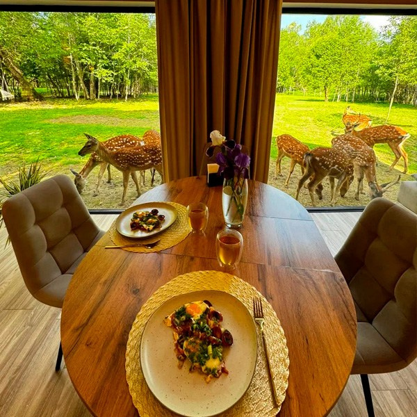 Единственное место в России где домики находятся в вольере с пятнистыми оленями и кроликами. Безлимитное посещение контактной фермы — гладьте и кормите оленей, коз, страусов, хаски!