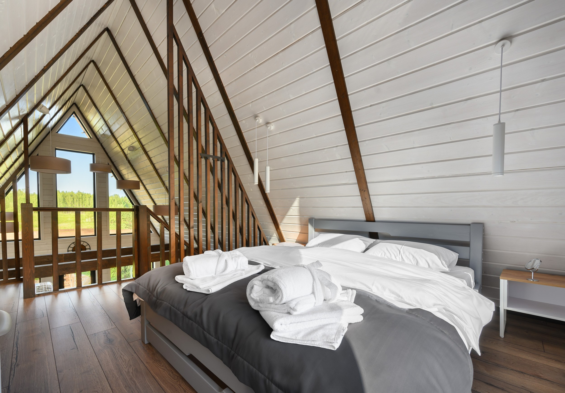 В доме сауна с банными принадлежностями (гели, шампуни, зубные наборы), даём веник для бани. также есть: бытовая техника + Смарт ТВ и Алиса, хорошая посуда на 6 человек, большая кровать в комнате на первом этаже, большая кровать на мансарде, большой диван в гостиной.