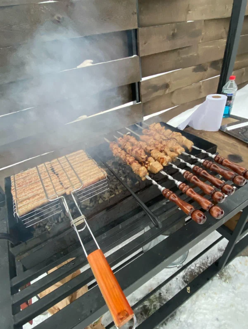 У мангала: решетки, шампуры, инструменты, розжиг, мешок угля 3кг в качестве комплимента.